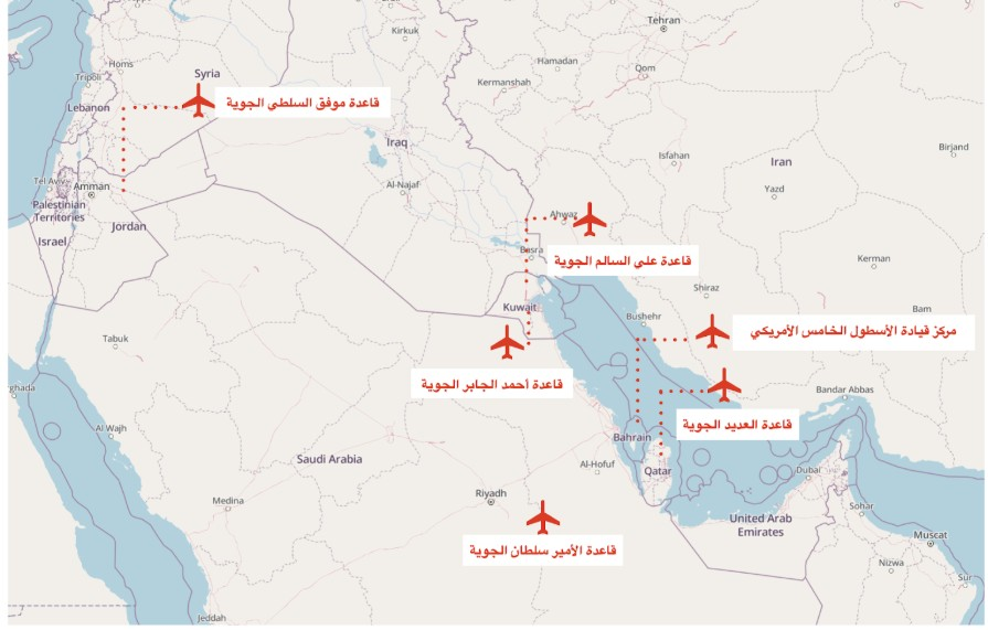 ففي قطر، رُصد تمركز أكثر من 20 طائرة تزوّد بالوقود ونحو 15 طائرة شحن، إلى جانب طائرات استطلاع وتدريب. وفي الأردن، استقبلت قاعدة موفق السلطي قرابة 20 طائرة شحن ثقيل، إضافة إلى مقاتلات F-15E Strike Eagle.