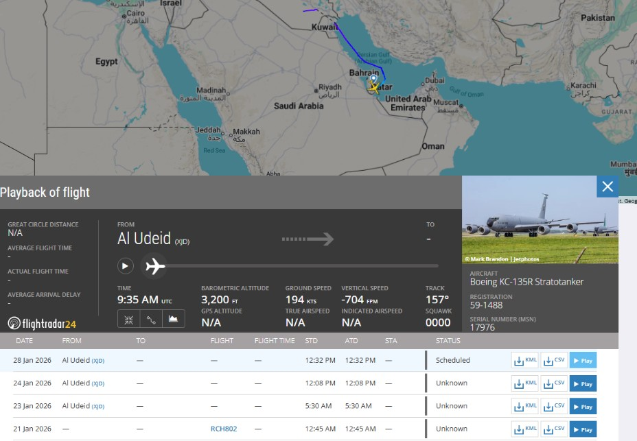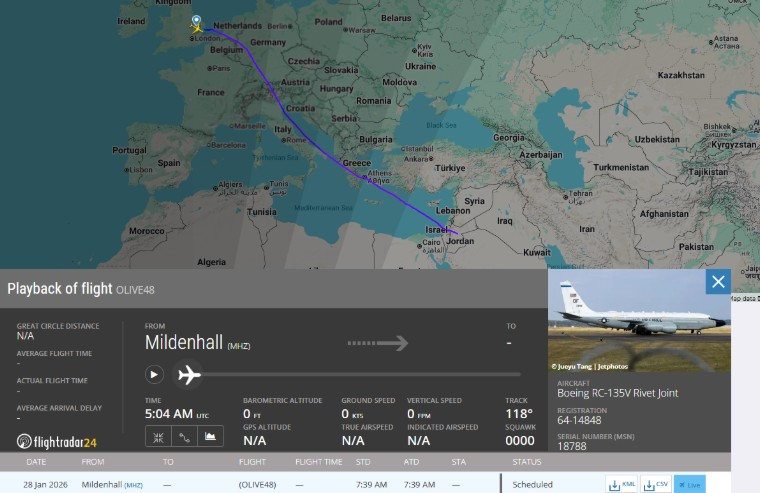 في صباح 28 يناير/ كانون الثاني 2026، أقلعت طائرة أمريكية من طراز Boeing RC-135V Rivet Joint (رقم تسجيل 6414848) من قاعدة Mildenhall في بريطانيا متجهة إلى المنطقة. هذه الرحلة كانت الأولى للطائرة نحو الخليج منذ مغادرتها قاعدة العديد في مارس/ آذار 2025، بعد 3 أشهر من النشاط قبالة الساحل الإيراني آنذاك.