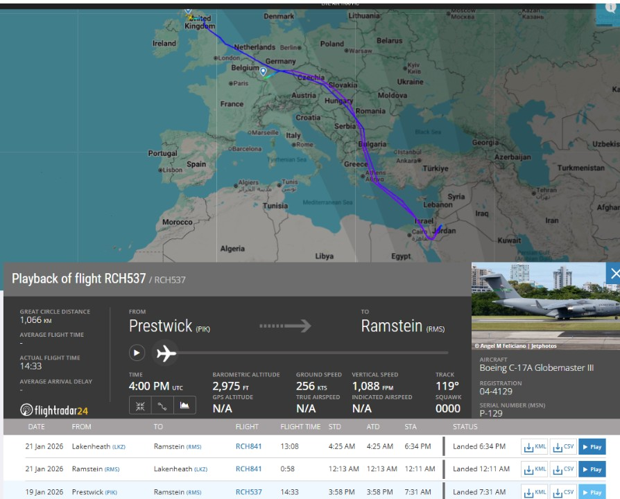 هذه الطائرات مصممة لنقل الدبابات والمركبات المدرعة والمروحيات والجنود لمسافات بعيدة، مع القدرة على الهبوط في مدارج قصيرة. وتكرار رحلاتها بين رامشتاين وPrestwick وقواعد الخليج يوحي بإعادة تموضع مستمر للعتاد، لا مجرد تعزيز رمزي.