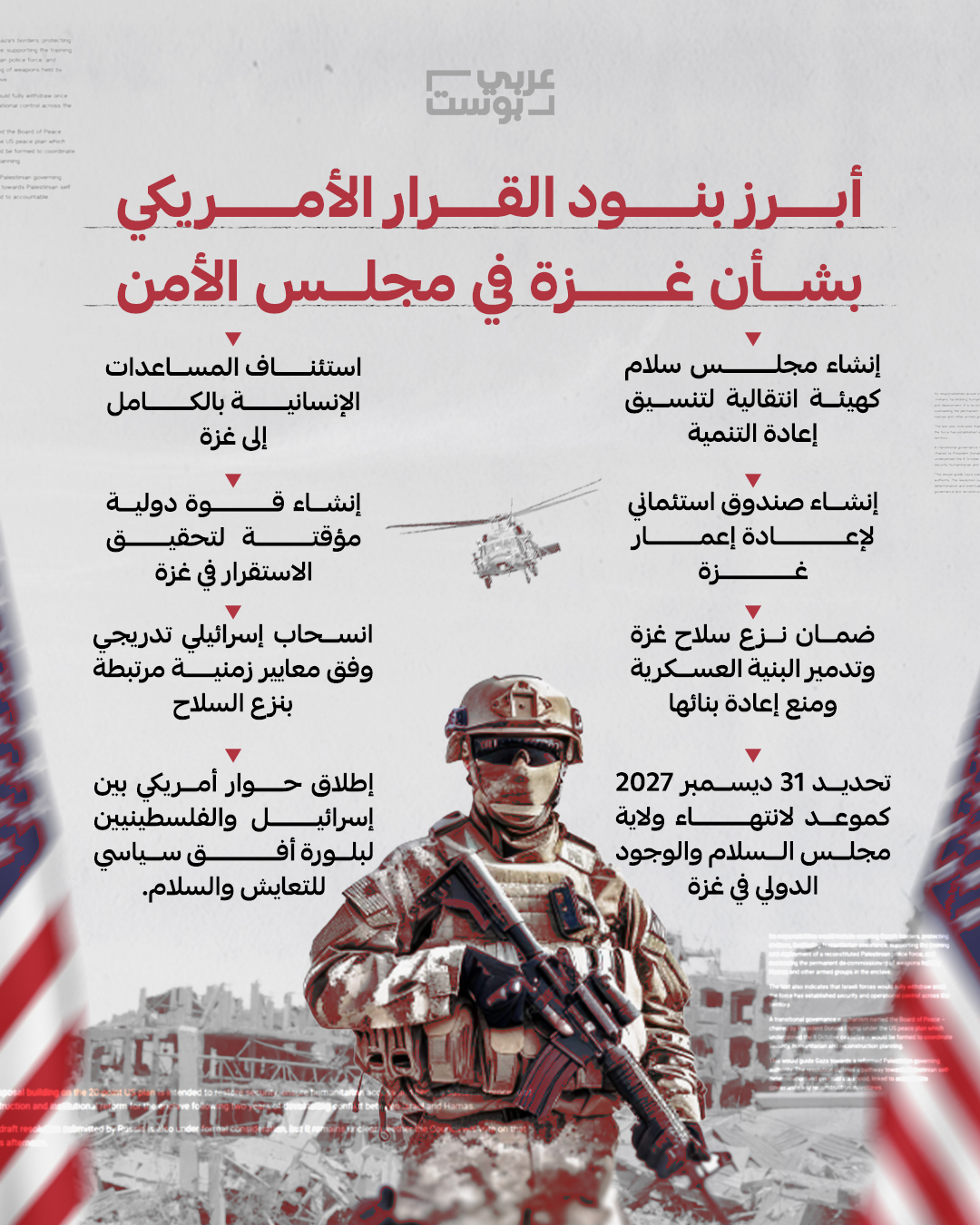 - السماح بإنشاء كيانات تشغيلية لـ"مجلس السلام"، لإدارة الحكم الانتقالي والإعمار والخدمات والمساعدات وتنظيم حركة الدخول والخروج من القطاع.