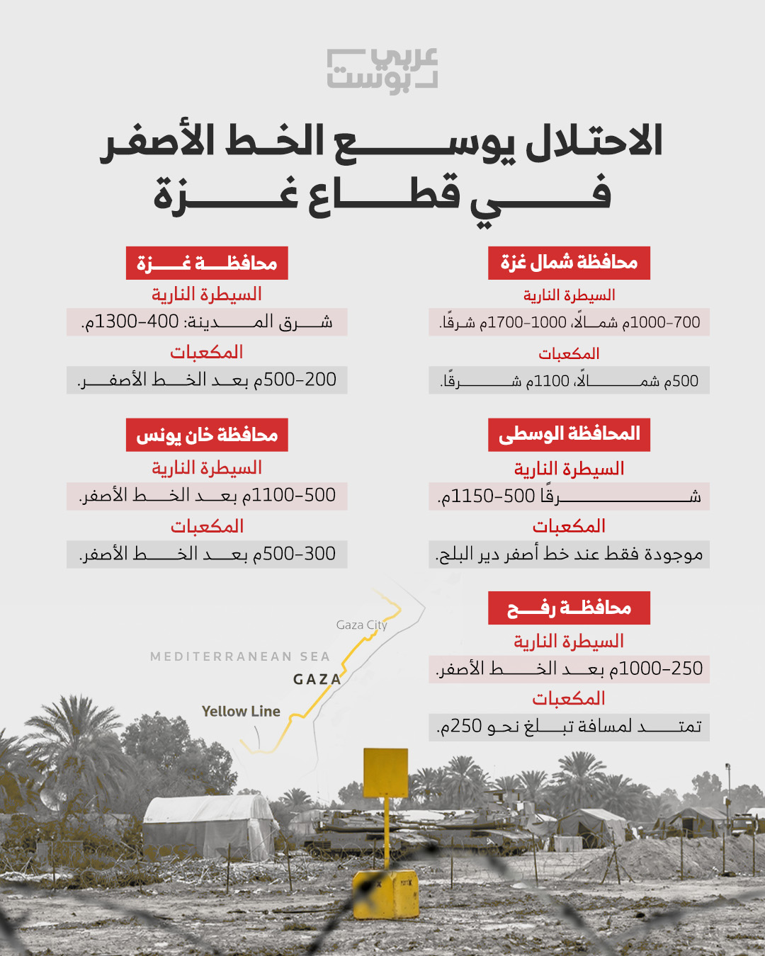 ويتسع نطاق منطقة السيطرة النارية الإسرائيلية مع الوقت، مع تقدم الاحتلال الإسرائيلي في مناطق عدة، حيث تشير المصادر الميدانية إلى أن هناك عملية توسيع لـ"الخط الأصفر" في مناطق عدة.