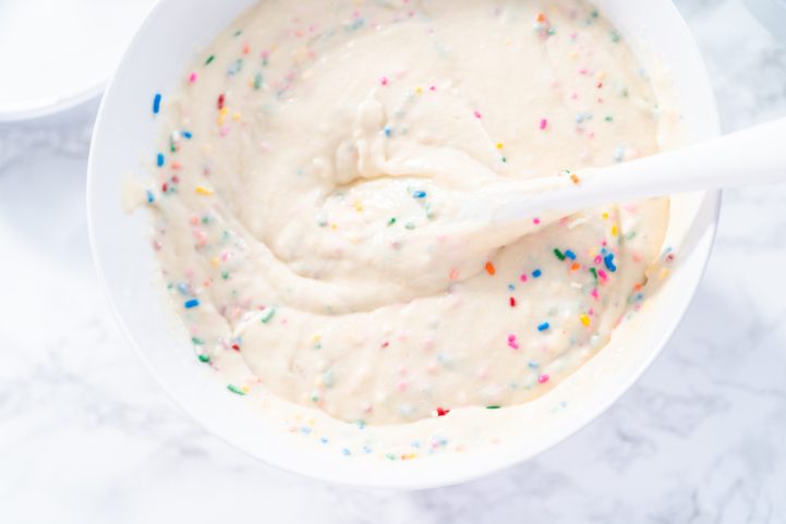 4. (إذا لم تستخدمي خليط كيك Funfetti الخاص واستخدمتِ عوضاً عنه خليط كيك عادي، فأضيفي الحبات الملونة التي تستخدم للتزيين عادة، وحرّكي بواسطة ملعقة)، ثم ضعي المزيج في الفرن لمدة 25 دقيقة حتى ينضج.