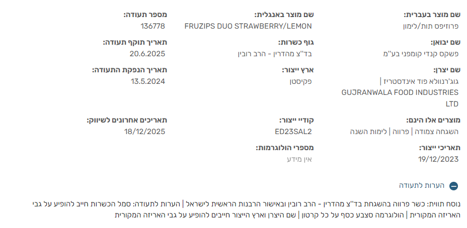 يمكن الاطلاع على البيانات المتعلقة بهذا المنتج الحاصل على شهادة "كوشير"، للتسويق داخل إسرائيل، من خلال هذا الرابط (عدد المنتجات وصلاحية الرابط قابلة للتغيير بحسب التحديثات المستمرة من قبل الحاخامية الكبرى).