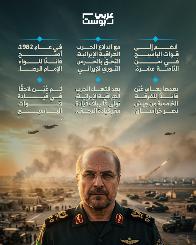 منذ البداية، يتشكّل هذا المسار داخل بيئة ثورية–عسكرية. مع انطلاق الثورة الإسلامية، يبدأ قاليباف نشاطه داخل الباسيج، ثم ينتقل سريعًا إلى ساحة الحرب العراقية–الإيرانية ضمن صفوف الحرس الثوري الإيراني. هنا لا يظهر كمجرد عنصر في الجبهة، بل كجزء من منظومة إدارة الحرب نفسها، حيث تولّى مسؤوليات استخبارات العمليات، وهو ما يضعه مبكرًا في قلب "العقل العسكري" لا في أطرافه.