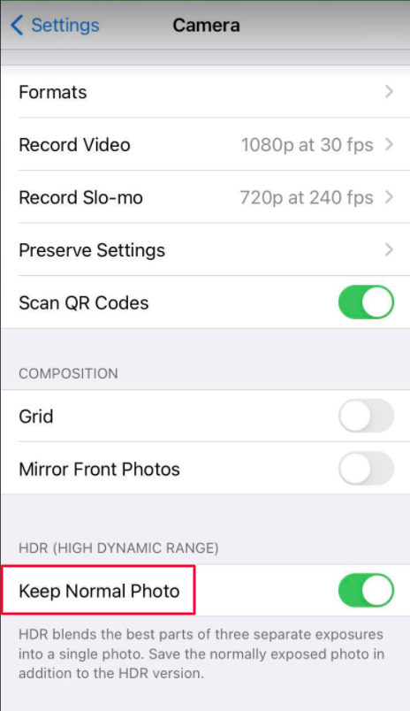 توجه إلى أسفل الصفحة وعطِّل خيار "احفظ الصورة الأصلية" Keep Normal Photo، وهناك أيضاً خيارٌ مشابه لوضع الصور الشخصية Portrait يمكنك تعطيله.